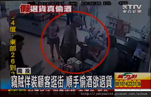 偷竊手法再度翻新,一名竊賊到了南投一家便利商店後,假裝逛街結果順手摸走商店裡價值一千元的進口洋酒,而這名竊賊離去之前,還走到櫃檯,假裝要向店家退回偷來的酒,但店家表示,需要有購買證明才可以辦理退貨,而這名竊賊也就順理成章的把酒帶出商店,而店家也把監視器畫面張貼上網,希望抓到這名惡劣的竊賊。
